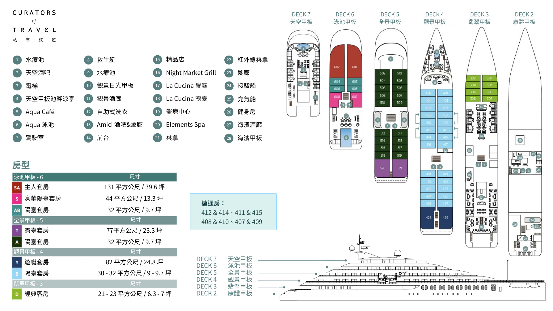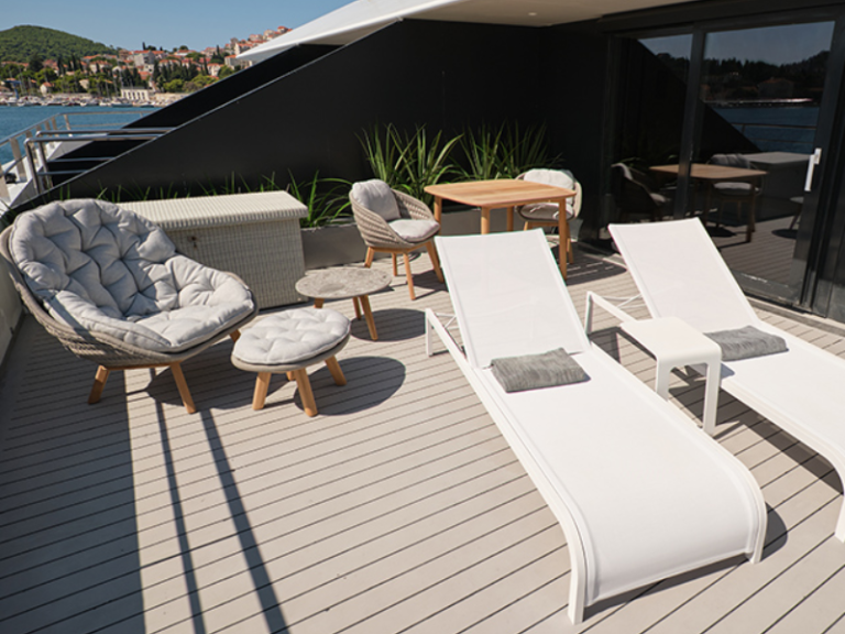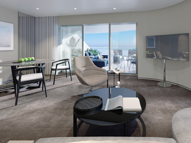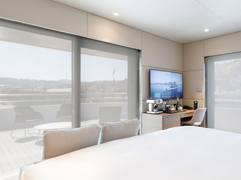 遊艇套房設有環繞式私人露臺與細緻規劃的室內空間,讓您沉浸在壯闊的海景中。