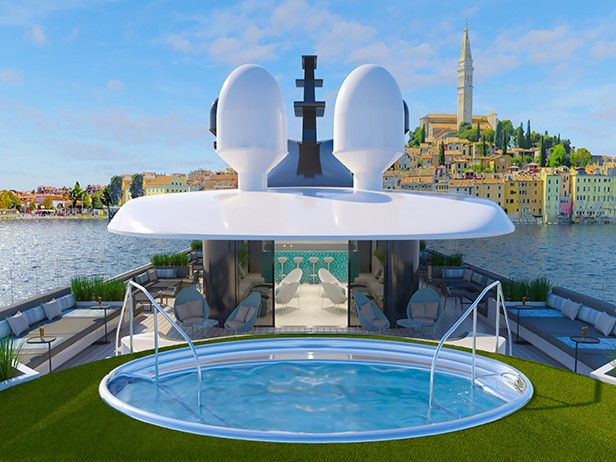 在遊艇尾端的露天泳池甲板上,您可悠然浸入無邊際泳池,盡情享受沁涼時光。